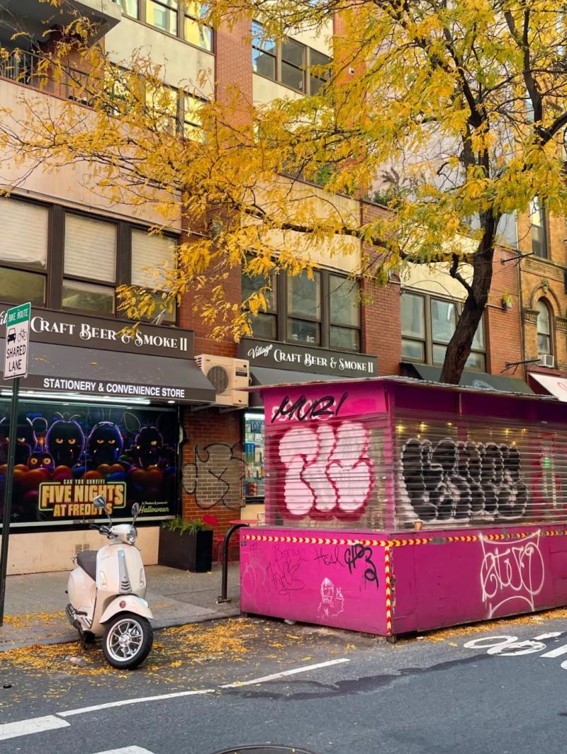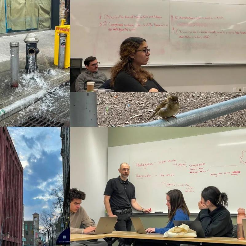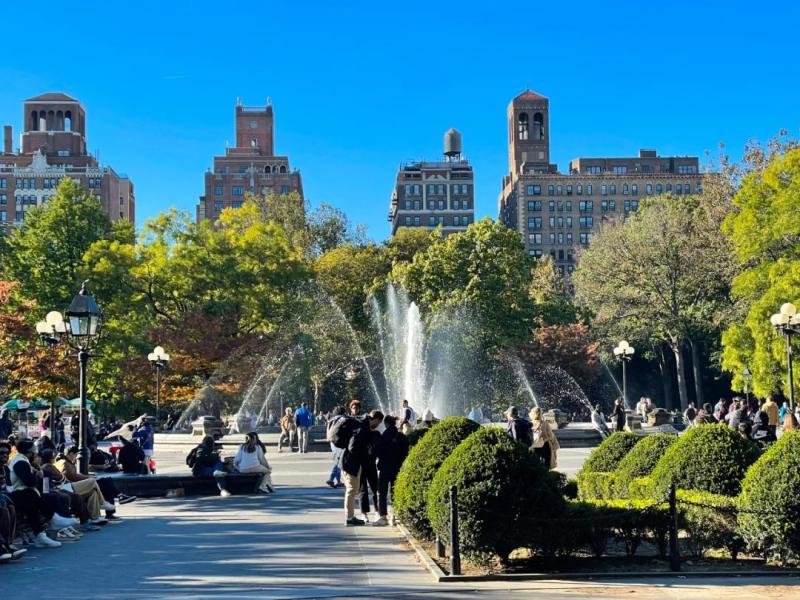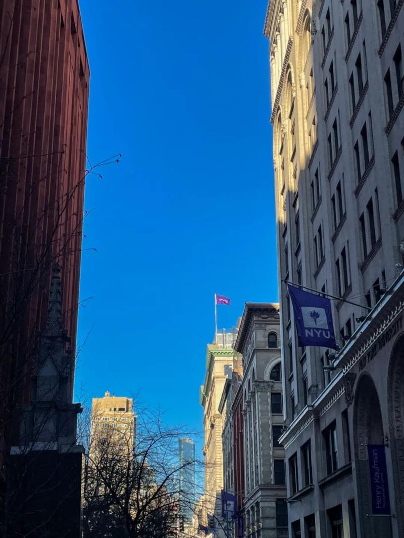 纽约大学没有栏杆圈地围绕起来的校园。在NYU读书就仿佛已经一只脚踏入了社会,每天坐地铁上学如同打工人早起去上班。 各个教学楼坐落在商业建筑、娱乐设施等之间,你可能走着走着就看到一个大大的NYU旗子挂在墙上(表明这是NYU所有的建筑物)。走去教学楼上课路上,分不清与你相邻的赶路人是你的同学还是白领。