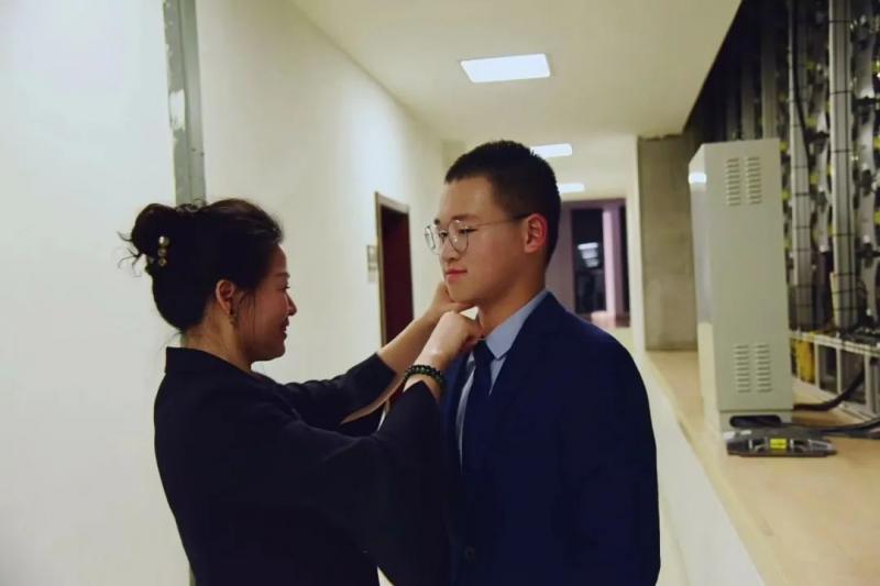 | 妈妈给当合唱节主持人的博天同学整理衣装