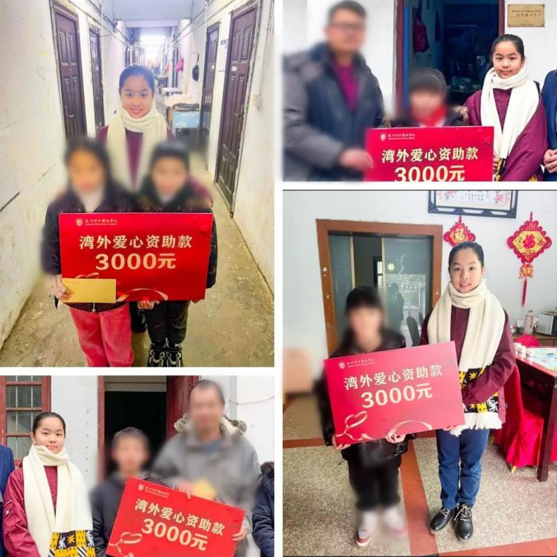 根据吴江区民政局的推荐,学校挑选了学习优秀的4名贫困学生,在小学部辛锋校长的带领下,吴亚轩同学与湾外一行走访了贫困学生,并将“湾外爱心资助款3000元”送达到每一位同学手上,亲手传递了湾外的温度。