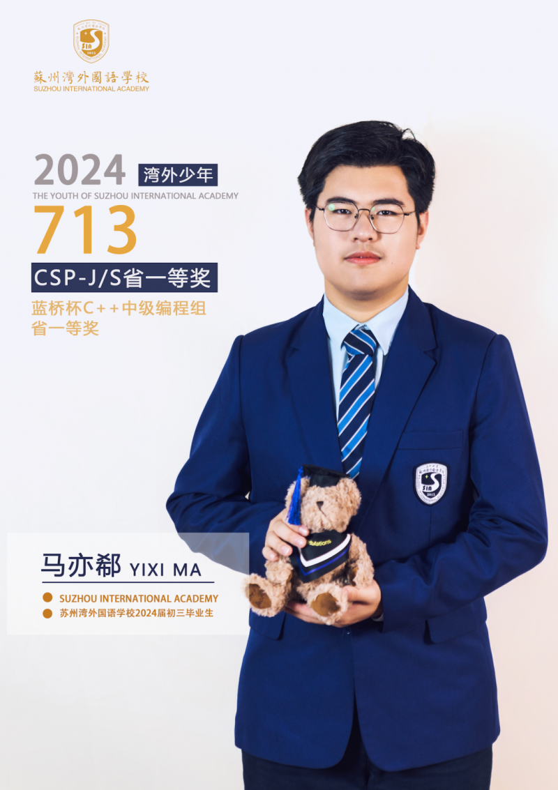 在自我成长的道路上,马亦郗始终在不断进取。马亦郗不仅擅长理科,更是一名计算机高手。自小学三年级接触编程后,他便爱上了计算机编程,“它能用简单的语句表达,实现复杂的功能,高效且简洁。同时,计算机程序设计也很好地锻炼了我的逻辑能力和统筹能力。” 七八年级的编程选修课上,马亦郗持续进修编程技术,更是在湾外计算机老师的带领下,在各大赛事中取得佳绩。