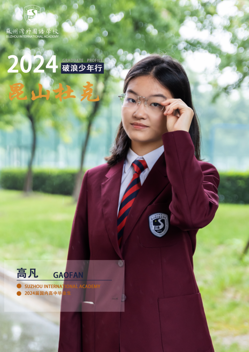 高凡在小学五年级进入湾外学习,学习和生活中她总是性格开朗,大大咧咧。在校期间,高凡积极参加各类活动,包括义卖、运动会、外语嘉年华等。她还担任过多项职务,如宣传委员、化学课代表、物理课代表、数学课代表等,并在初中担任纪检部部长,高中担任学生会执行主席。这些经历丰富了她的校园生活,也锻炼了她的组织和领导能力。
