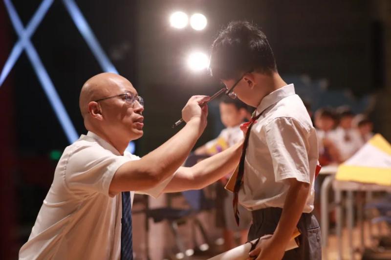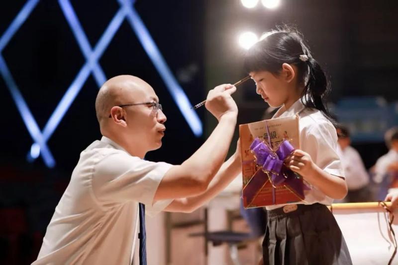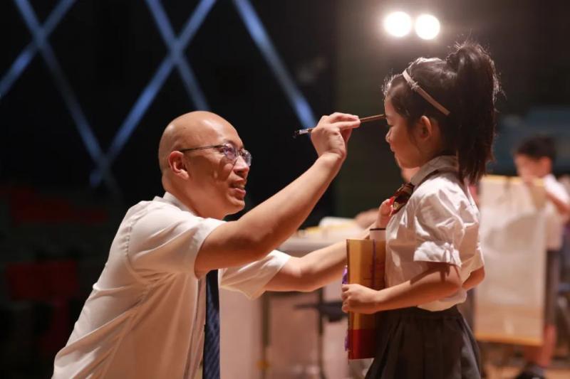 朱砂启智,礼润人生。在古代,“点朱砂”又被称为“开天眼”,寓意着孩子消除蒙昧,开启智慧。小学部辛锋校长为每一位一年级新生点上朱砂,以此寄托美好的愿望,希望湾外学子们从此眼明心明,热爱读书。