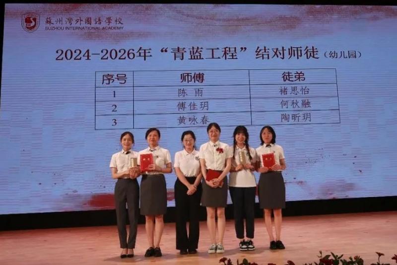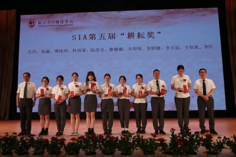 |苏州湾外国语学校总校长尤文亮和副总校长罗天涛为在职5年的员工们颁发了“耕耘奖”。