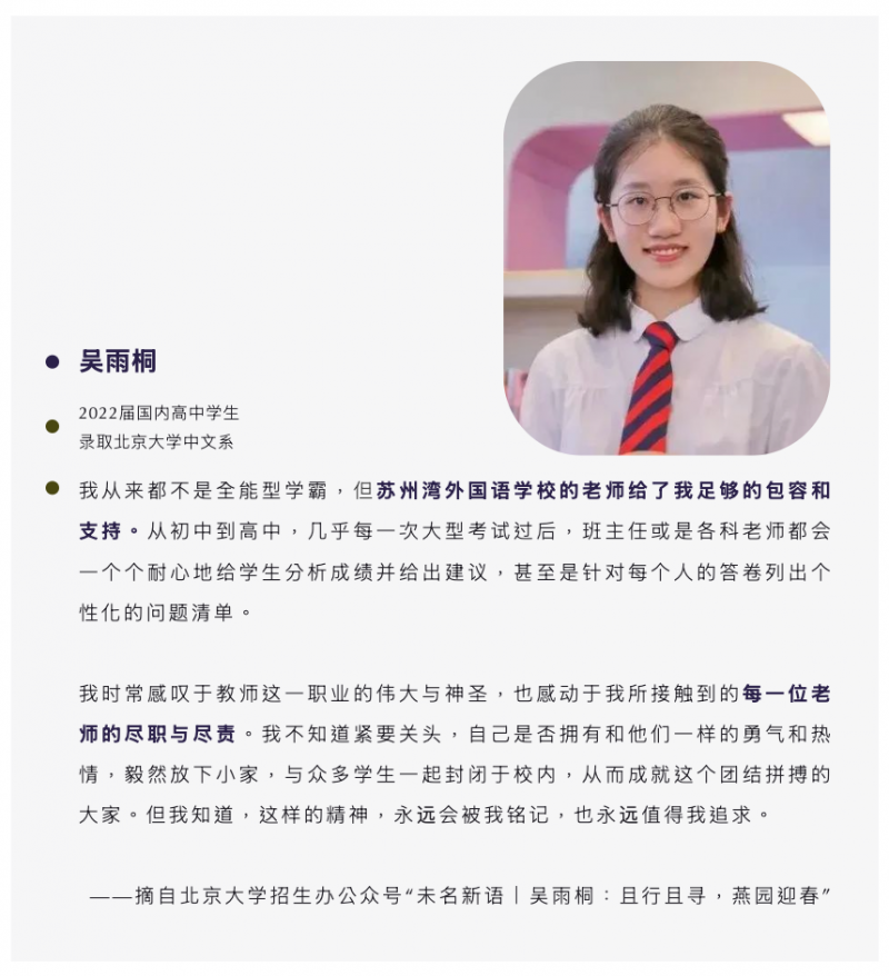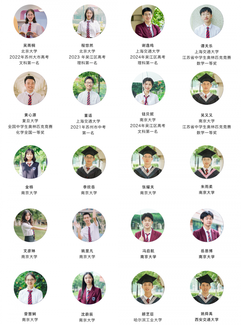 2022年,吴雨桐同学以大市历史类最高分录取北京大学;2023年,程悠然同学以区物理类最高分录取北京大学;2024年,谢逸鸣、钮贝妮同学分别获得区物理类和历史类高考总分第一名,物理类两名同学达清北强基录取线。