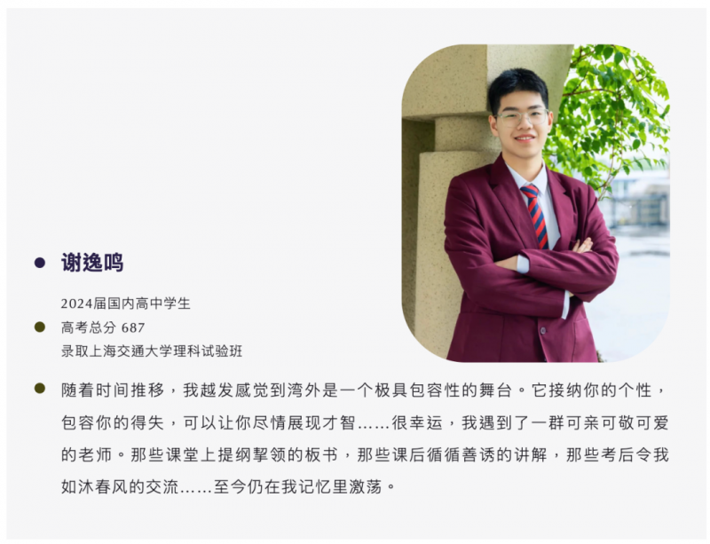 国内高中部目前的师生比约为1:4,平均1位老师指导约4个学生!每位学生都能充分享受到优质的教育资源小班化教学,每班学生不超过30人,每位学生都能享受到个性化、精致化的教育。