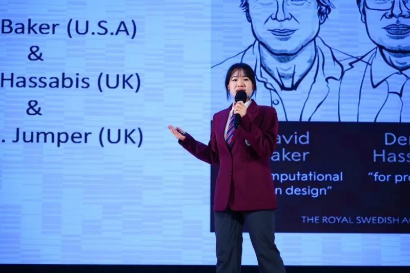 随后,刚刚拿到剑桥大学面邀 offer 的周湘鋆和商潇木同学带来了关于诺贝尔奖的全英文专题分享。她们用生动的语言介绍了2024 年诺贝尔奖得主的研究成果,激发了在场学生对科学探索的热情。